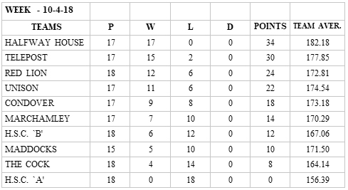 Maddocks are back up and running with a journey out to The Cock Inn but were unable to snatch the two points from their opponents. The Cock finished wwith a 174 against the visiting team’s 172 points after some tight shooting from both squads. They remain near the foot of the table but Maddocks have three matches in hand, the Cock have shot all eighteen of their matches for the season.